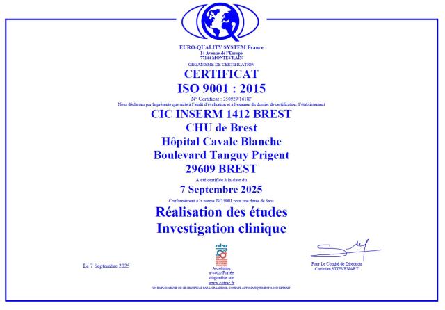 Les activités d'investigation clinique (réalisation des études) conduites par le CIC bénéficient désormais d'une certification à la norme ISO 9001 version 2015. Cette certification a été obtenue le 7 septembre 2025, auprès de l'organisme EURO-QUALITY SYSTEM. Le pilotage du système de management de la qualité du CIC est placé sous la responsabilité de la cadre opérationnelle du CIC (Gisèle Marhic) et bénéficie de l'expertise continue d'une responsable assurance qualité (Nolwenn Jamet). Les professionnels du CIC sont par ailleurs directement impliqués dans cette démarche, en particulier par l'intermédiaire d'un comité de pilotage dédié.