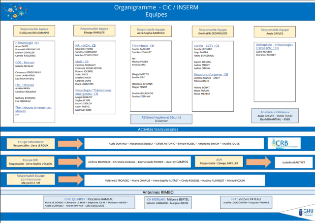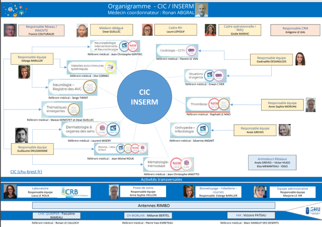 L'équipe de direction travaille en lien étroit avec les responsables d’équipe et la responsable du laboratoire du CIC, qui oeuvrent au quotidien pour que la mise en œuvre des projets de recherche au CHU de Brest se fasse de manière optimale, c'est à dire dans le strict respect des protocoles et en assurant le bien-être et la sécurité des participants.